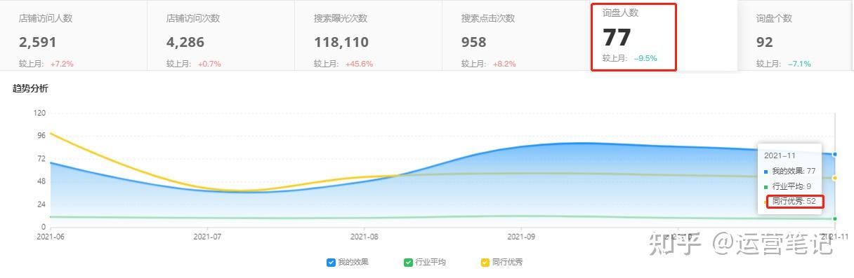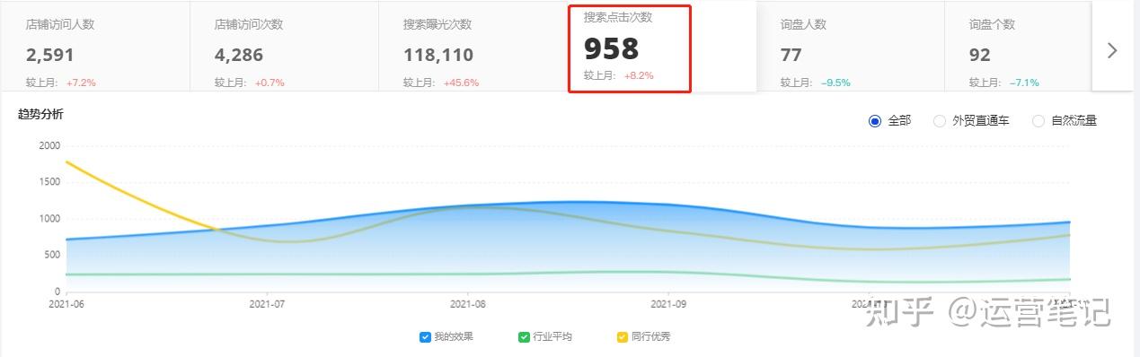 数据概览:通过查看数据概览,大概了解现在店铺的流量情况、看下日访客数,曝光、点击、询盘/TM、及时回复率这些数据,对比下和同行的差距,点选下每一项,和同行优秀做下对比,找找差距(下面这个平台的数据,访客数,点击量都没问题,但是询盘比同行的少)