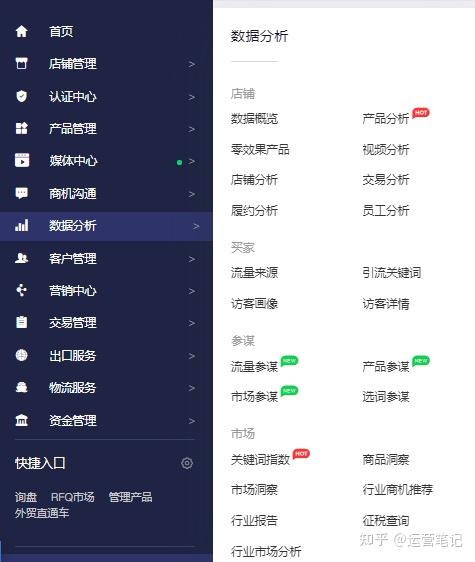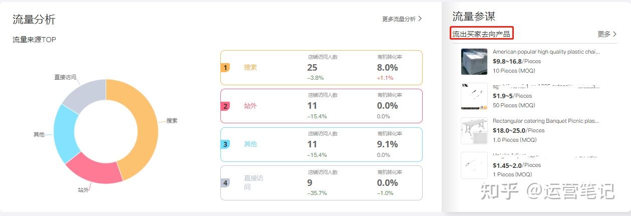 还有一点比较重要,金品诚企店铺可以到数据概览首页,关注下店铺流出买家去向产品是哪些同行的,可以研究下和同行产品的差距(价格、起订量、详情质量等)